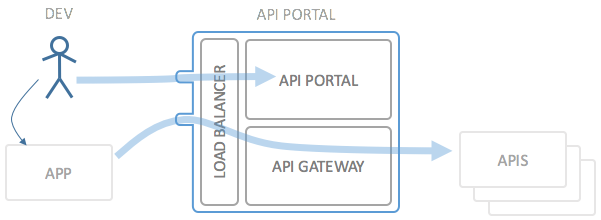 • As a developer ("DEV" in the diagram), I visit the API Portal (I log in, I look around,...) and find the API which I want to use for the Application ("APP" in the diagram) I am currently developing.